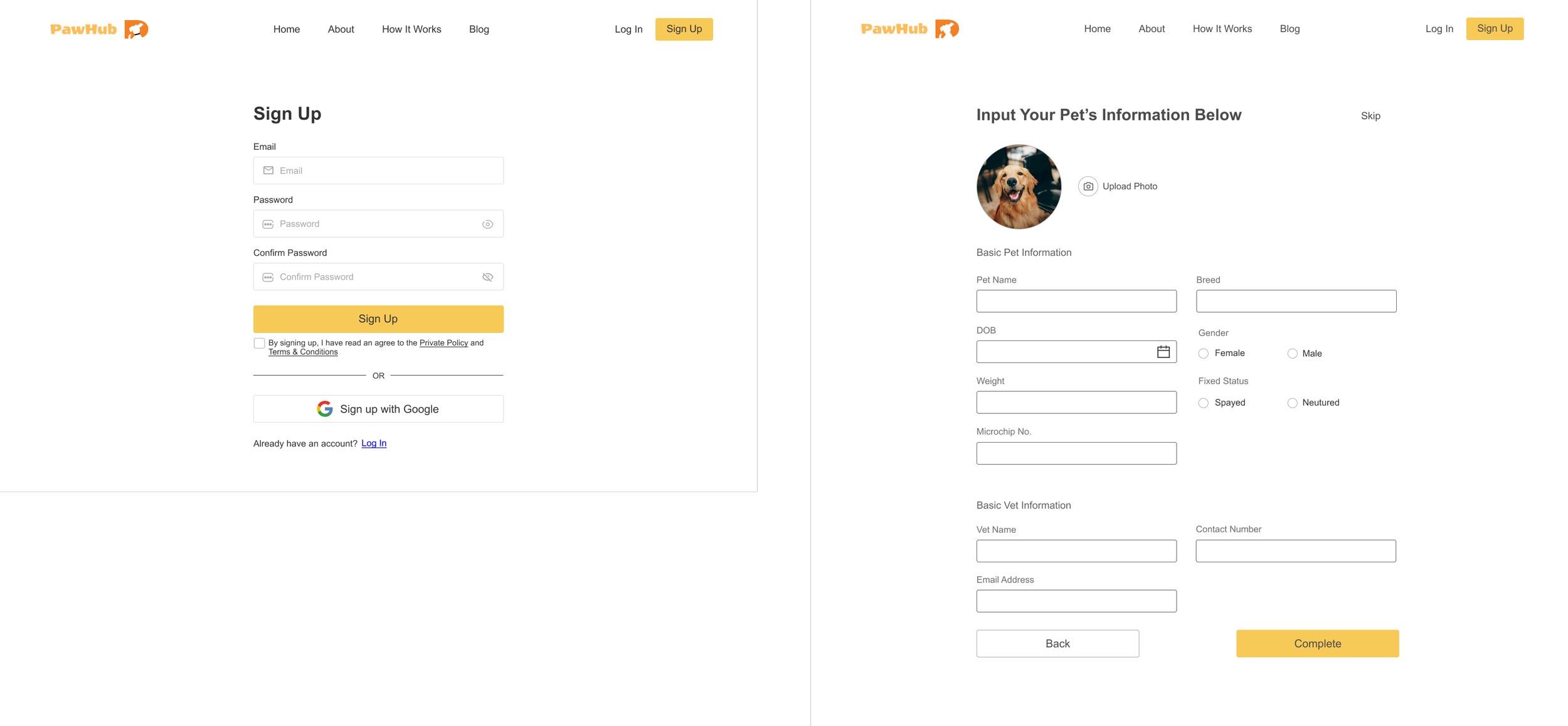The user would like to sign up with an account so they can start managing their pet’s profile.
